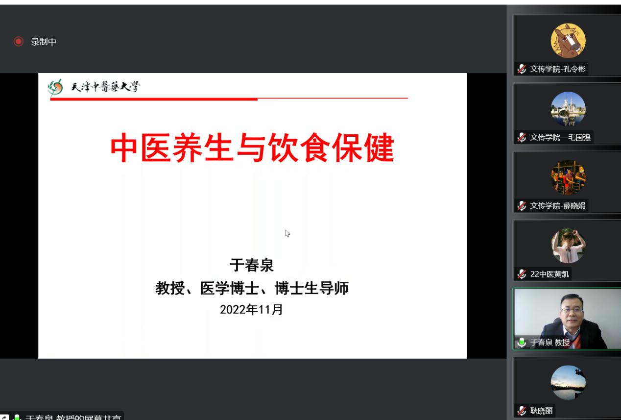 11月22日下午,受天津中医药大学文化与健康传播学院、党委教师工作部邀请,天津市卫健委中医处处长于春泉教授做客“人文大讲堂”和“立德修身系列讲堂”,在线上做了题为“疫情常态下如何维护身心健康——中医食疗与养生防病”的讲座。除了我校百余位来自各单位、各个学院师生外,讲座还吸引了来自天津市中医药文化进校园试点校170余位师生参加,近300名大学、小学师生同上一堂中医养生课。