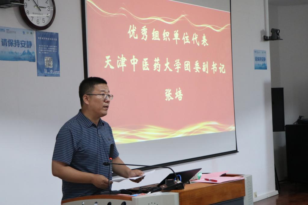 天津中医药大学团委副书记张培老师作为优秀组织奖获奖单位代表上台发言,分享心得体会。他结合自身工作与活动参与经历,从青年学生的视角出发,讲述了在推动中医药文化传播过程中的所见所感,以及如何引导学生更好地参与到中医药文化传承中来。
