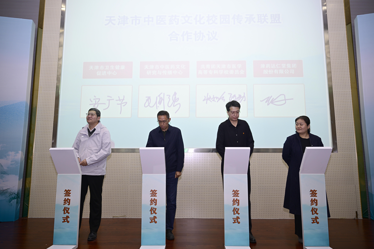 天津市卫生健康促进中心、天津市中医药文化研究与传播中心、共青团天津市医学高等专科学校委员会、津药达仁堂集团股份有限公司共同组建天津市中医药文化校园传承联盟,并现场完成合作签约,未来各方将在资源共享、活动策划等领域开展深度合作。
