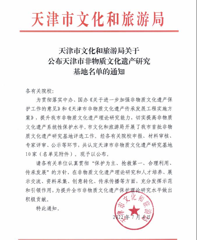 据了解,为提升我市非物质文化遗产理论研究能力,切实提高非物质文化遗产系统性保护水平,天津市文化和旅游局开展了我市首批非物质文化遗产研究基地评选工作。经各有关院校申报、专家现场考察、材料审核、评审、公示等环节,最终认定了首批天津市非物质文化遗产研究基地10家。