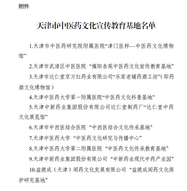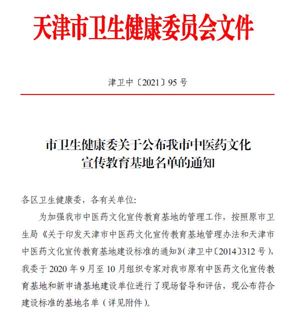 2021年2月,天津市卫健委公布了天津市中医药文化宣传教育基地名单,包括天津中医药大学中医药文化研究与传播中心在内的10家单位名列其中。