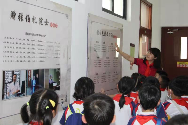 在文化与健康传播学院“中医药文化长廊”里,白迪迪、耿晓娟两位老师为小学生们讲解了中医药成语、诗词、“人民英雄”张伯礼院士的诗词,带领他们欣赏了院士、国医大师、名中医的书法作品等,让孩子们近距离感受到中医药文化的魅力。