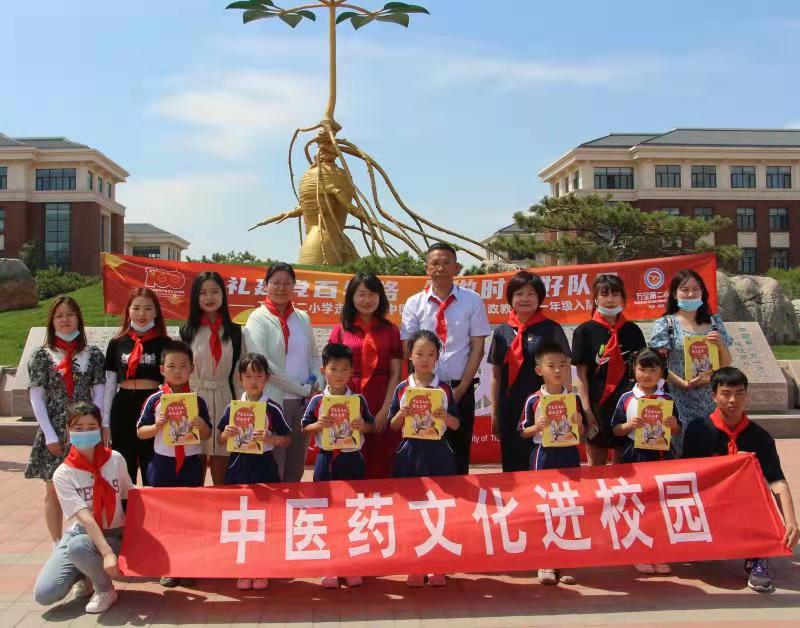 在人参广场,万全第二小学一年级小学生举行了入队仪式。院长毛国强教授与我校师生一起为小学生们戴上了鲜艳的红领巾,还赠送了《中医药文化精选读本》。2019级传播学易兆全同学分享了勇博班努力拼搏、积极向上的感人故事。