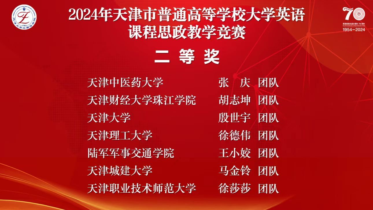 本次竞赛由天津市教育委员会主办,天津大学承办,高等教育出版社协办,分初赛、复赛、决赛三级赛制。初赛阶段,我院外语教研室教师积极组队参与,认真备赛并制作参赛作品,并邀请天津外国语大学、天津医科大学、我校马克思主义学院的专家教授给予指导,选送优秀作品参加复赛。天津市高校共选送了54个参赛作品参加复赛网络评审。我院张庆教师团队通过激烈的角逐,作为16支晋级的教学团队之一顺利跻身决赛。在决赛中,张庆、谭秀敏两位教师协作备赛,由张庆作为展示选手,基于抽选素材进行10分钟的全英文教学设计阐述和5分钟的现场问答,深入挖掘教学素材中的思政元素,凭借其出色的教学设计和稳定的现场发挥,最终荣获二等奖。